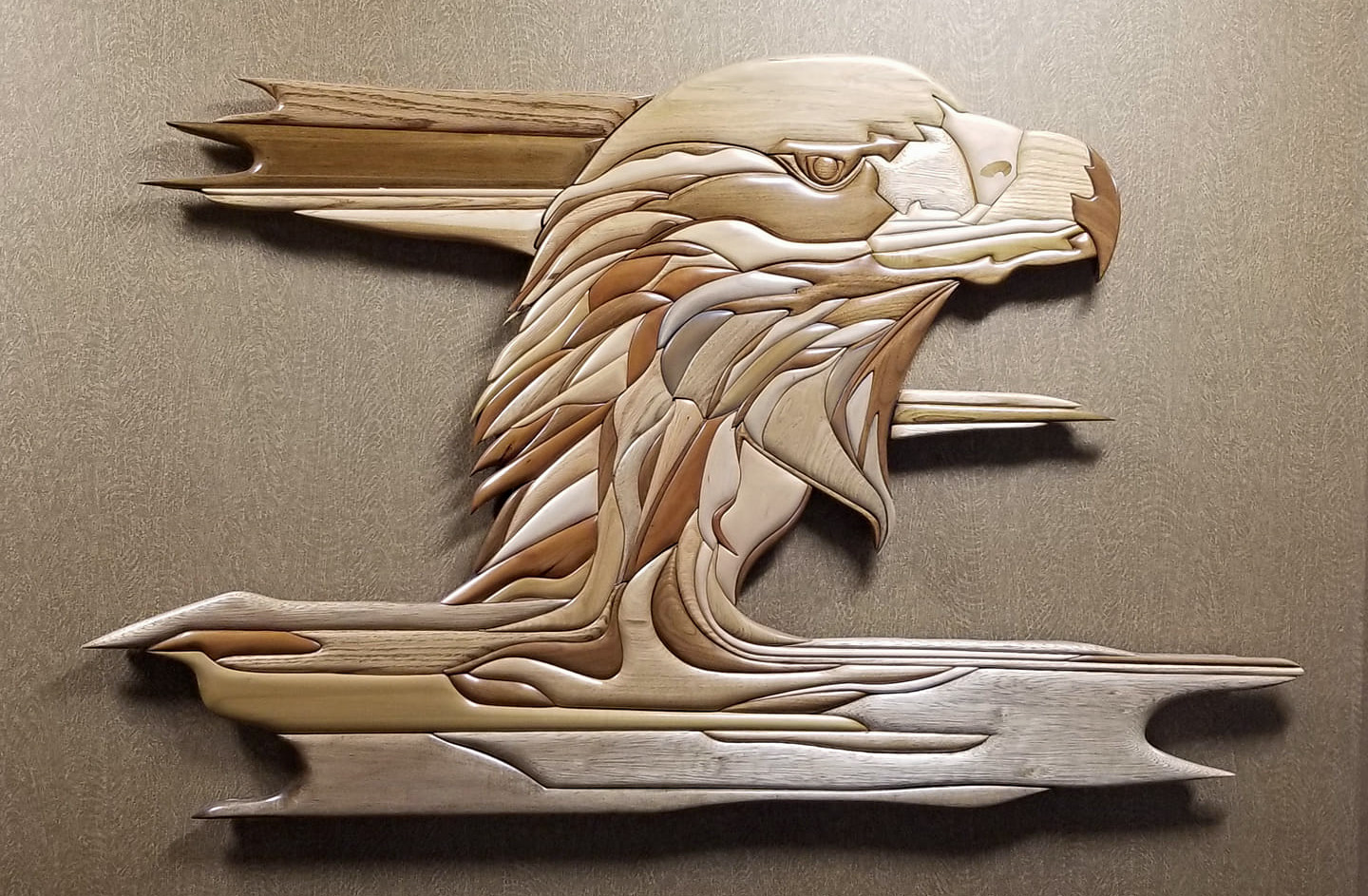 Dahmen’s path to working with wood was revealed through an unexpected observation of his golden eagle drawing. “I began to see feathers, the feathers resembled the grains of wood,” he remembers. With basic tools—a coping saw and some files—he began translating that drawing into a wood sculpture.